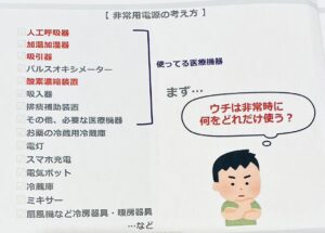 私からは、ブルーポピーの利用者様がどのような医療機器や電化製品をどのように使用しているか、電源確保の必要性をお話しさせていただきました。